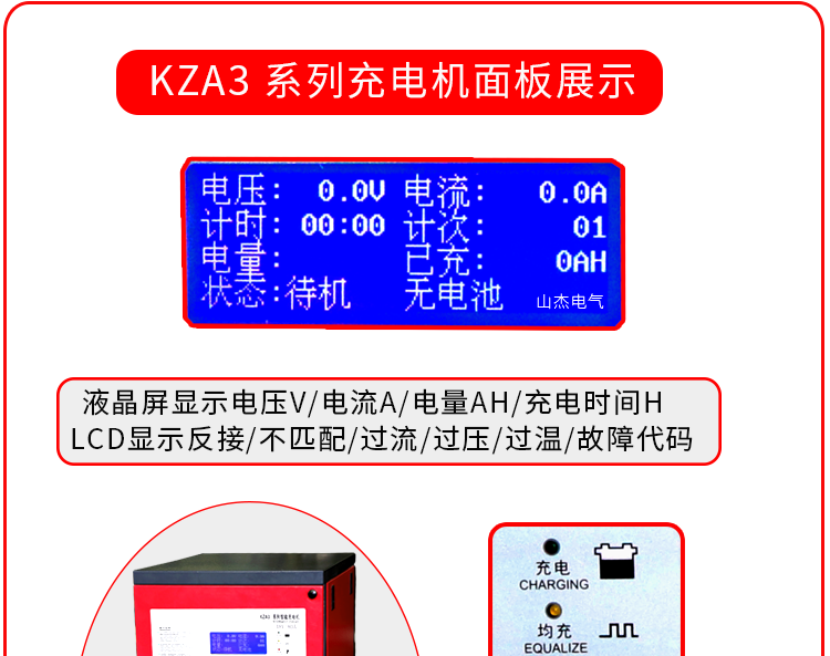 ? KZA3充電機(jī)具備電池未接,反接,欠壓,過(guò)壓,過(guò)溫,充足,及故障狀態(tài)自動(dòng)檢測(cè)顯示保護(hù)